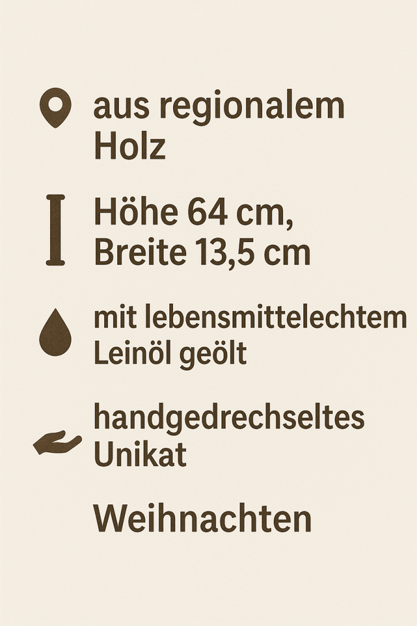 Unserer handgemachter gedrechselter Weihnachtsbaum aus Holz bringt festlichen Charme in Dein Zuhause. Jeder Baum wird mit großer Sorgfalt aus hochwertigem Holz auf der Drechselbank geformt. Durch die feine Handarbeit wird jeder Weihnachtsbaum zu einem einzigartigen Unikat, bei dem die natürliche Maserung des Holzes wunderbar zur Geltung kommt.