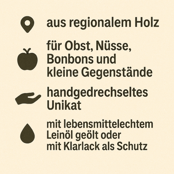 Unsere handgemachten gedrechselten Schalen aus Holz vereinen meisterhafte Handwerkskunst mit der Schönheit natürlicher Materialien. Jede Schale wird sorgfältig aus regionalem Holz gefertigt und auf der Drechselbank in ihre individuelle Form gebracht. Das Ergebnis ist ein einzigartiges Unikat, das durch die natürliche Maserung des Holzes seine ganz eigene Charakteristik erhält.